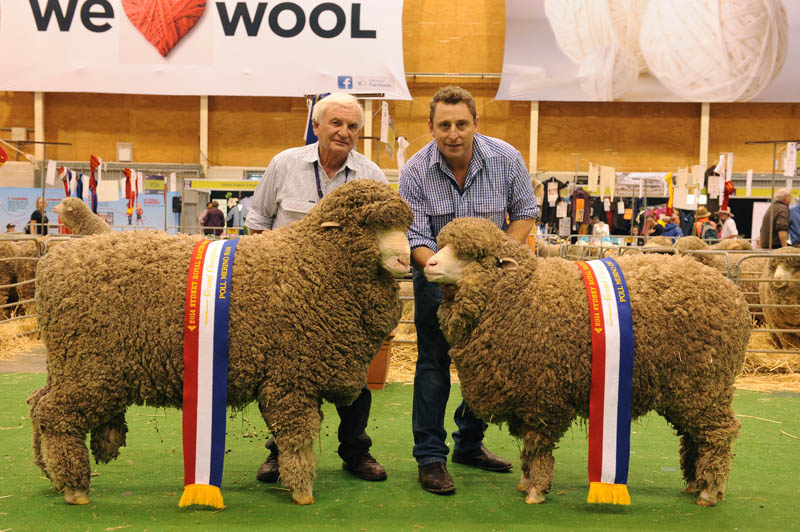 Roger Webster, Boorowa, and son-in-law Michael Corkhill, Grassy Creek stud, Reids Flat near Boorowa, with his grand champion Poll Merino ram and ewe.